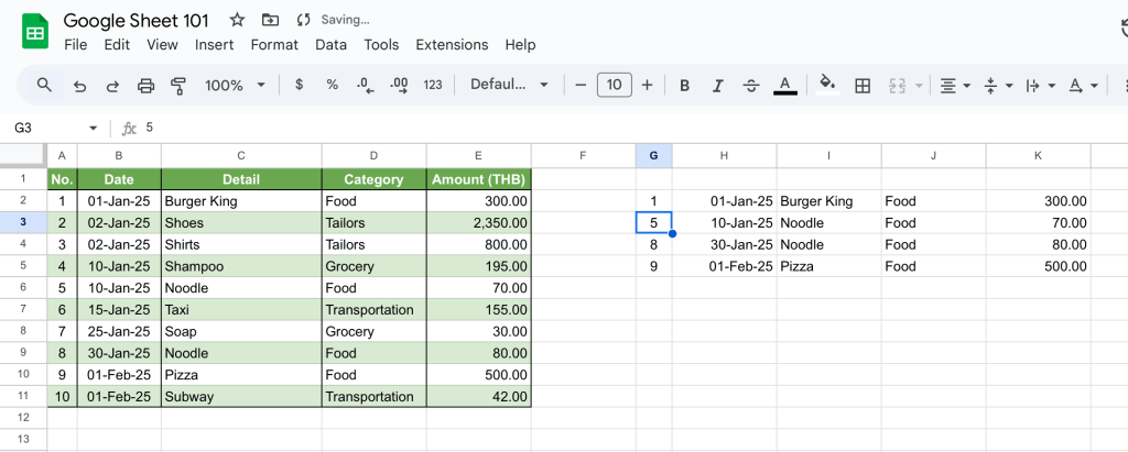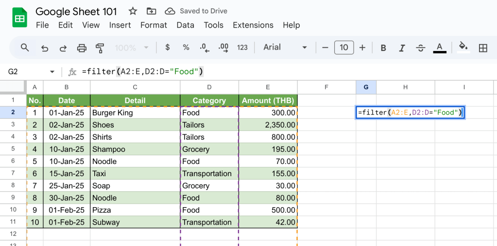 ใน filter เราให้ช่วงข้อมูลที่จะแสดงผลเป็น E2:E คือ ช่วงข้อมูลที่เป็นจำนวนค่าใช้จ่ายเท่านั้น