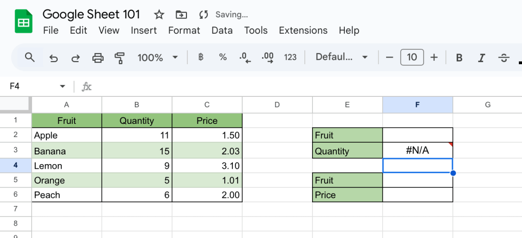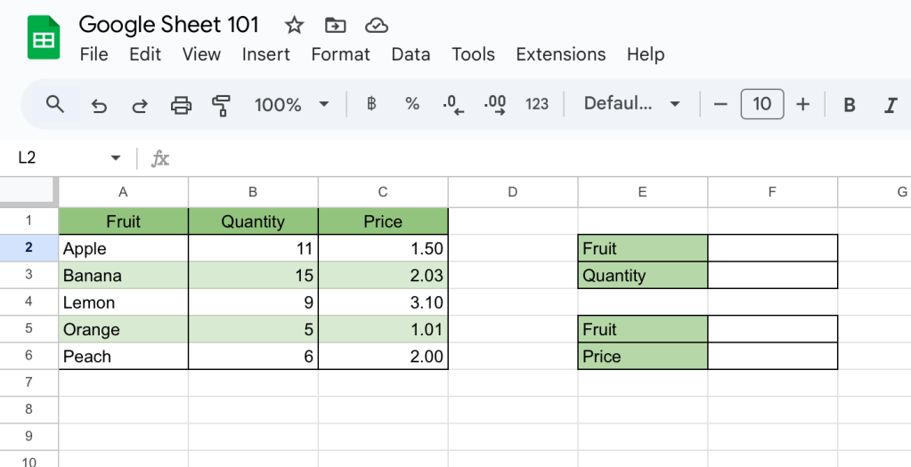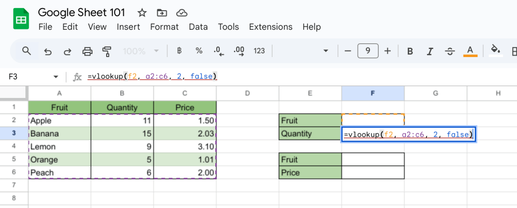 ส่วนตาราง 2 อันด้านขวา (Column E, F) จะเป็นตัวอย่างตารางที่ไว้ใช้ค้นหาจำนวนและราคาของผลไม้ที่เราต้องการ โดยตารางด้านบนเป็นการหาจำนวน ส่วนตารางด้านล่างเป็นการหาราคา